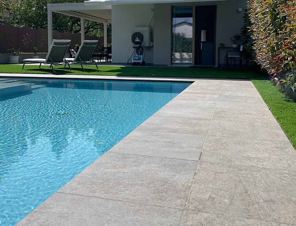 Per il camminamento a bordo piscina, le finiture, l’ingresso pedonale, il vialetto, il portico e i profili perimetrali è stato scelto HLA di Del Conca della collezione Lavaredo.